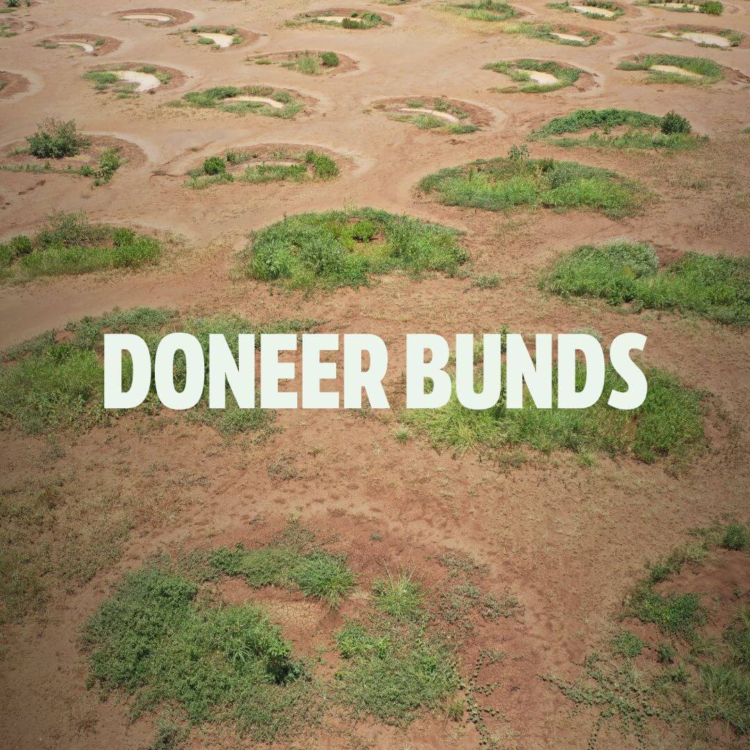 Water bunds zijn halvemaanvormige kuilen in de grond die regenwater opvangen, ook wel ”earth smiles” genoemd.